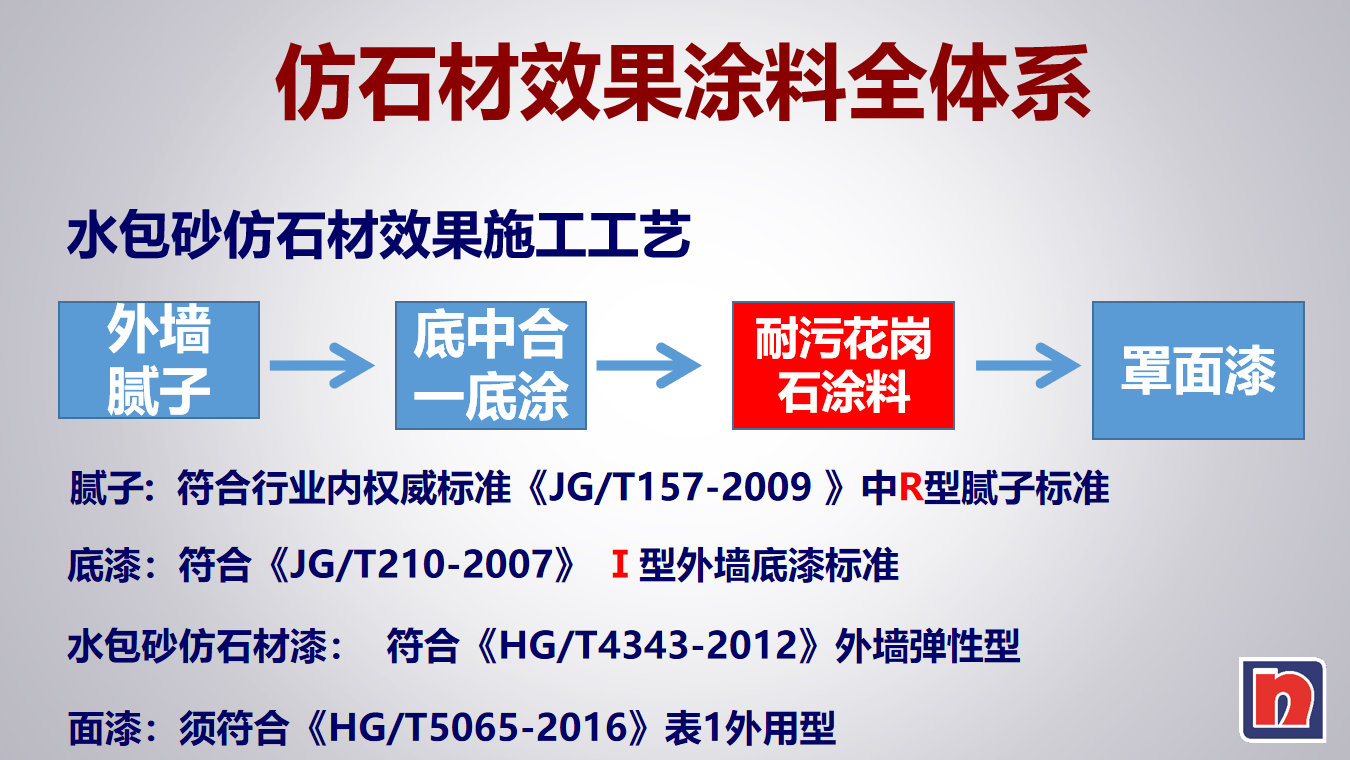 基層前處理(基層含水小于10%,平整度編差小于3mm)——批刮外墻專用膩?zhàn)痈稍?、打磨、養(yǎng)護(hù)、干燥、點(diǎn)膩?zhàn)舆_(dá)到施工要求、點(diǎn)補(bǔ)修理、干燥、打磨——涂抗堿底漆或油性封閉底漆——打磨、保養(yǎng)——施涂面漆——清理現(xiàn)場
